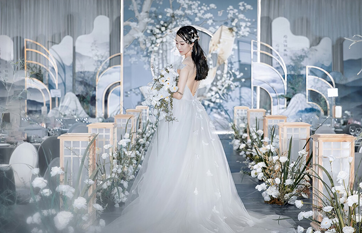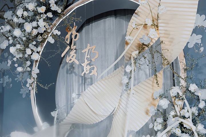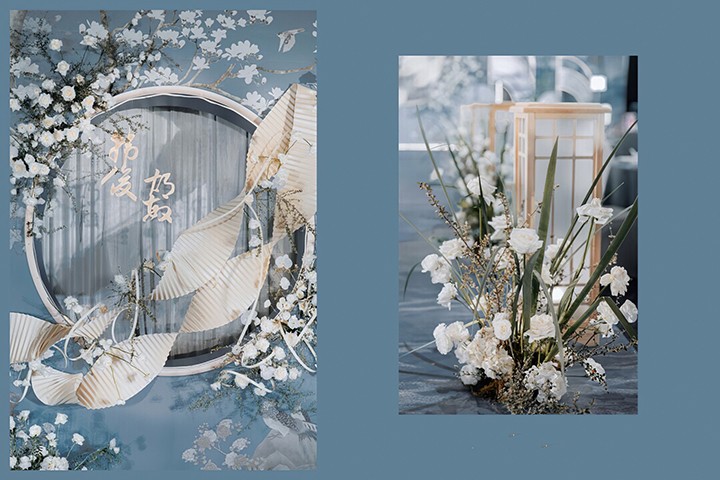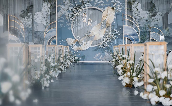 颠覆传统中式婚礼的红色,采用蓝色做为主色调,加入中国传统元素,感受中国传统婚礼文化的同时,有一种别样的清新雅致。